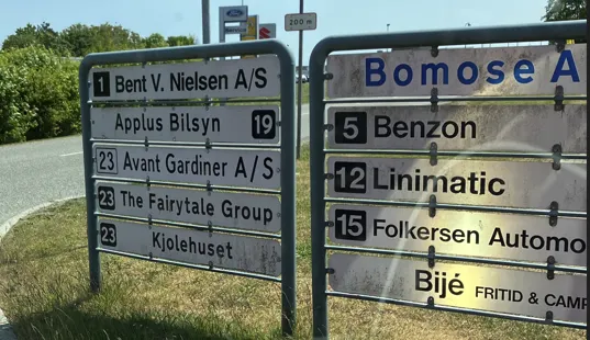 Ved indgang til industriområder i kommunen kan du få opsat et virksomhedsskilt. Prisen er 5.000 kr. og inkluderer selve skiltet, opsætning, vedligehold og eventuel fremtidig udskift.